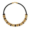 Collier de perles en forme de donuts en pierre naturelle enfilé sur un cordon de passementerie.