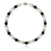 Collier en perles cylindriques en laiton brossées argentés avec perles grises et agate noir de 10 mm.